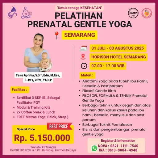 Kesempatan terbatas untuk Anda yang ingin sukses sebagai fasilitator Prenatal, Intranatal, Postnatal, dan Couple Yoga. Pelatihan ini terbuka untuk bidan, dokter, perawat, guru yoga, dan tenaga kesehatan lainnya.